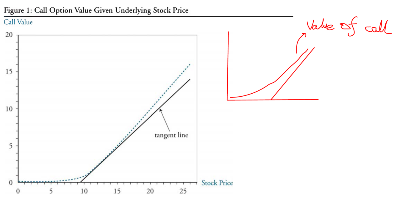 the change in the value of the call option is not constant when the stock price change, indicating the relationship is not linear