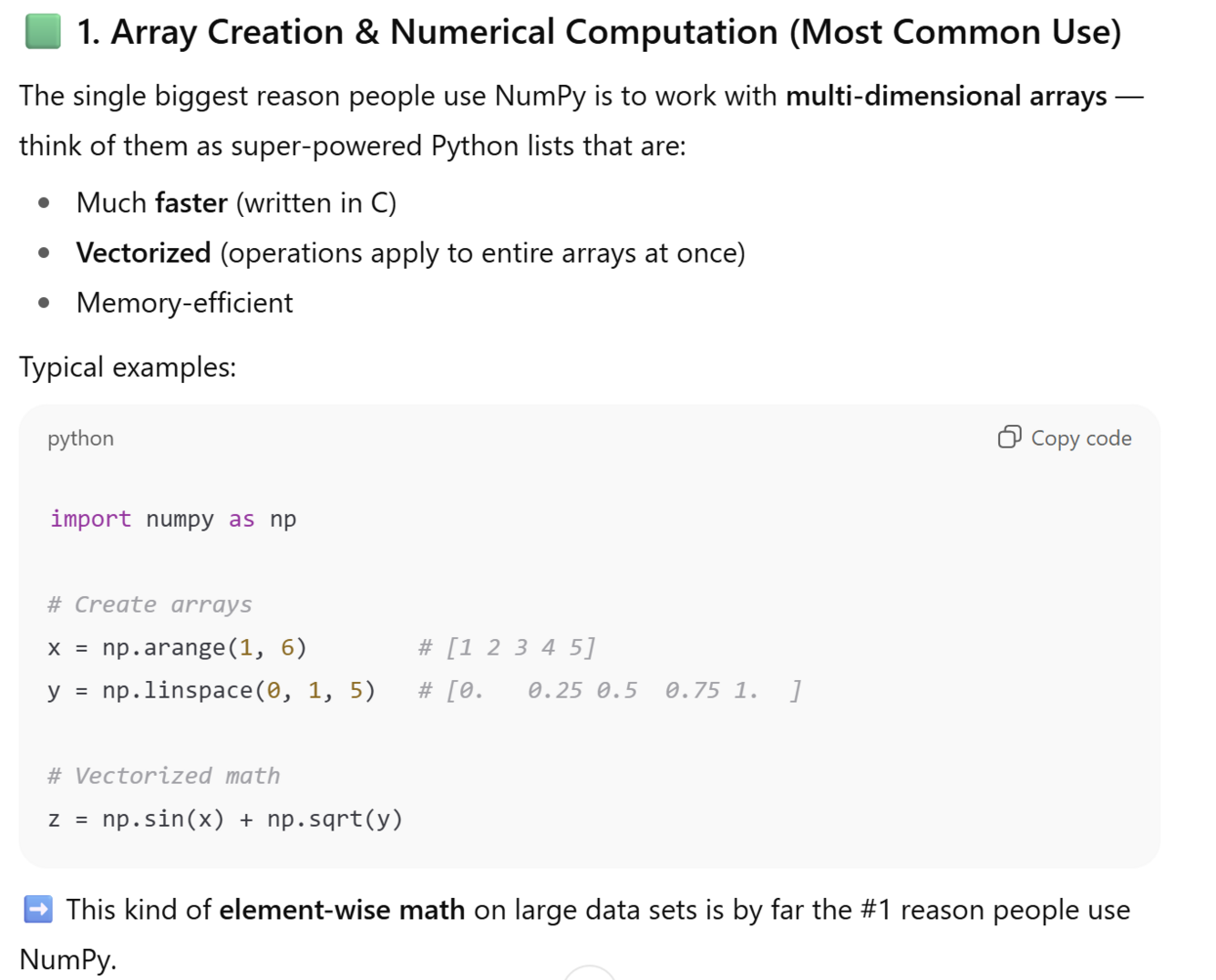 NumPy (short for Numerical Python) is a core Python library that provides: