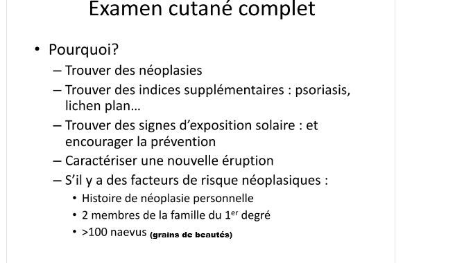 donne moi 3 indications à procéder à éxamen cutanée complet