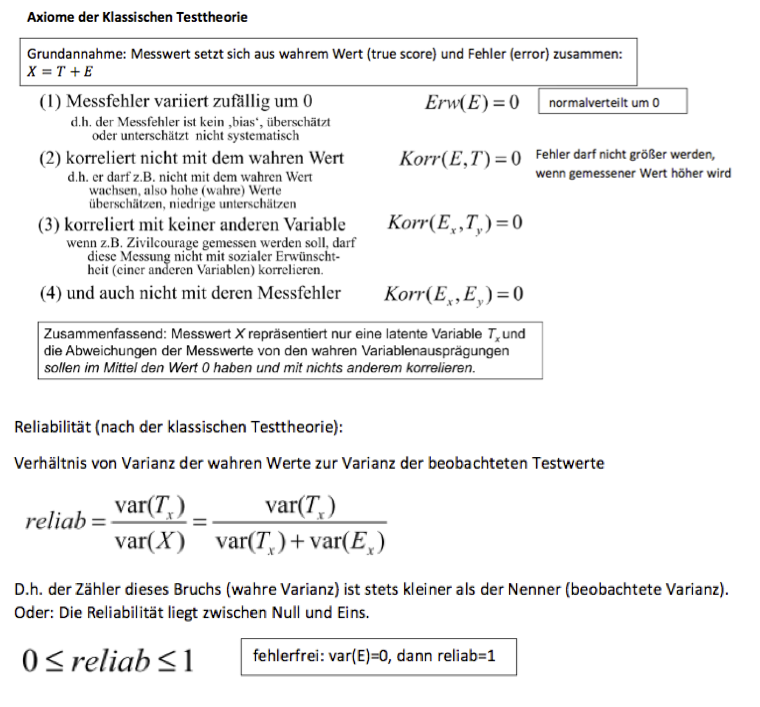 Q: Was ist die zentrale Annahme der klassischen Testtheorie? Was besagen ihre Axiome? Bezüglich der Reliabilität?