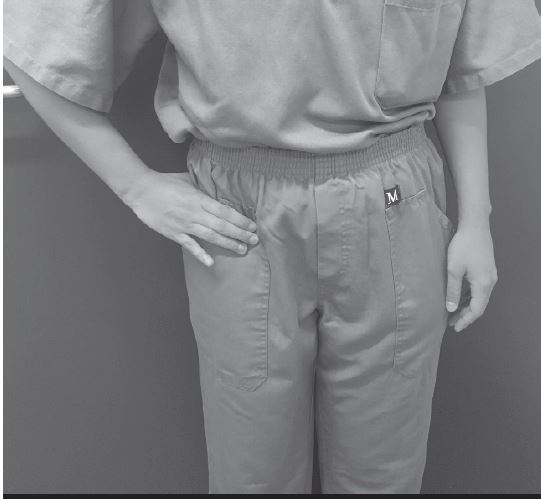 Descrição de uma dor interior profunda e mal definida na região do quadril, com a mão espalmada sobre a articulação e seu polegar voltado posteriormente, em forma de “C’.