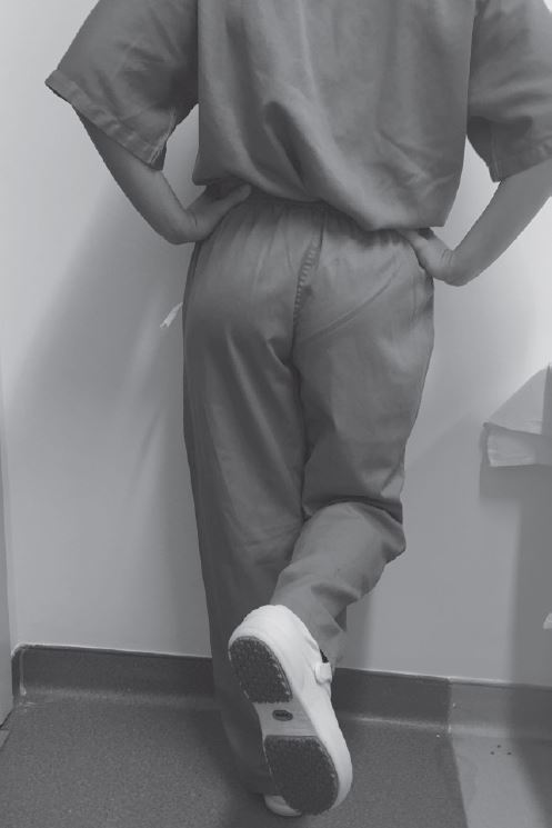 Realizar em frente a parede, mantendo o quadril em extensão (sendo eliminada a ação coadjuvante dos músculos flexores do quadril) e o membro inferior apoiado por pelo menos 6s.