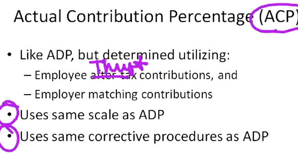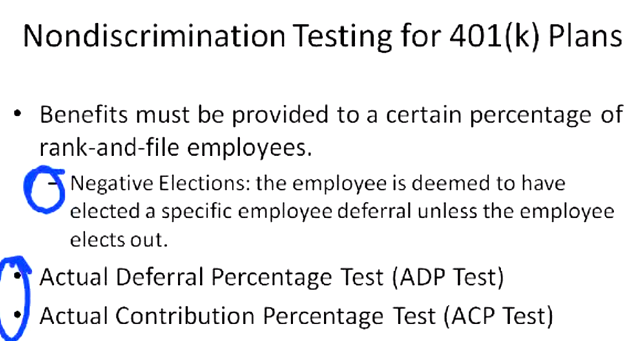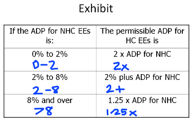 ADP Test - HC individuals can only defer based on what the NC are doing. If NC are 0-2%, HC can do 2x of that number. 2-8%, HC can do that plus 2%, If NC are doing 8+, HC can do 1.25x.
