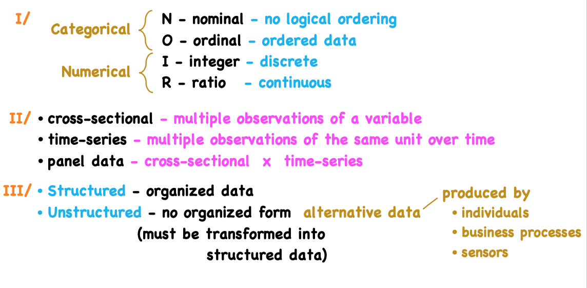 Describe nominal, ordinal, discrete continuous data, structred vs unstructured and CS, TS and panel and alternative data?