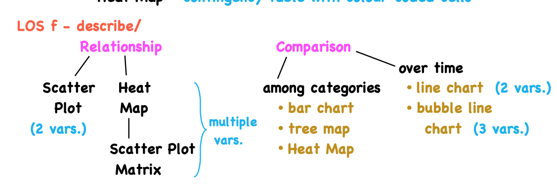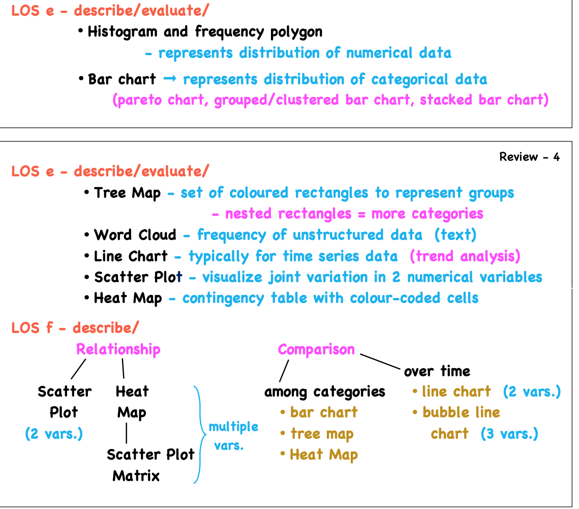 What types of data should be used in the following: Histogram and frequency polygon, Bar chart, tree map, word cloud, line chart, scatter plot, heat map.