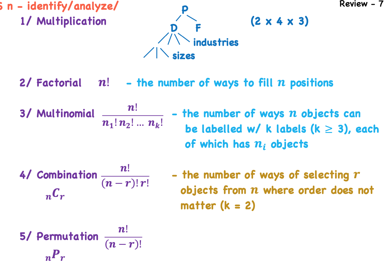 What are the multiplication, factorial, multinomial, combination and permutation number of ways?