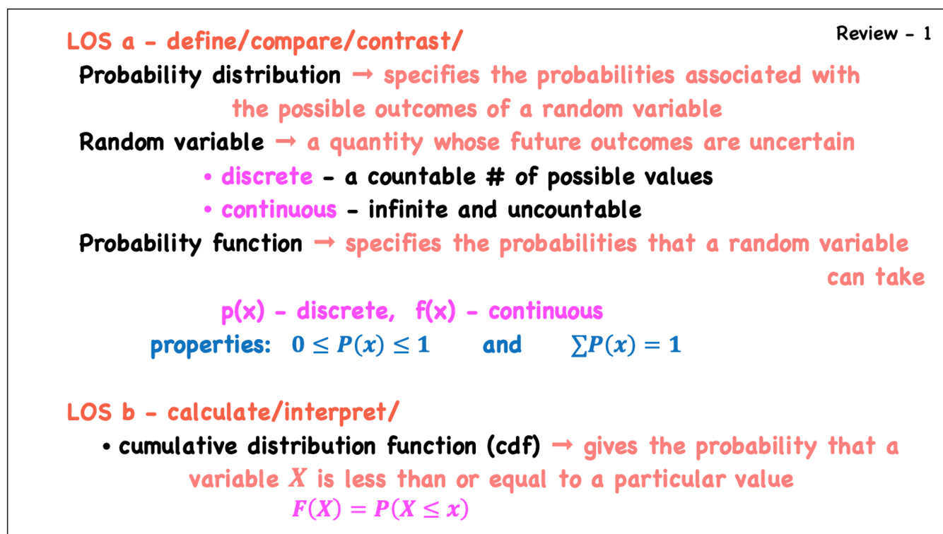 What is the definition for probability distribution, random variable, probability function and cumulative distribution function?