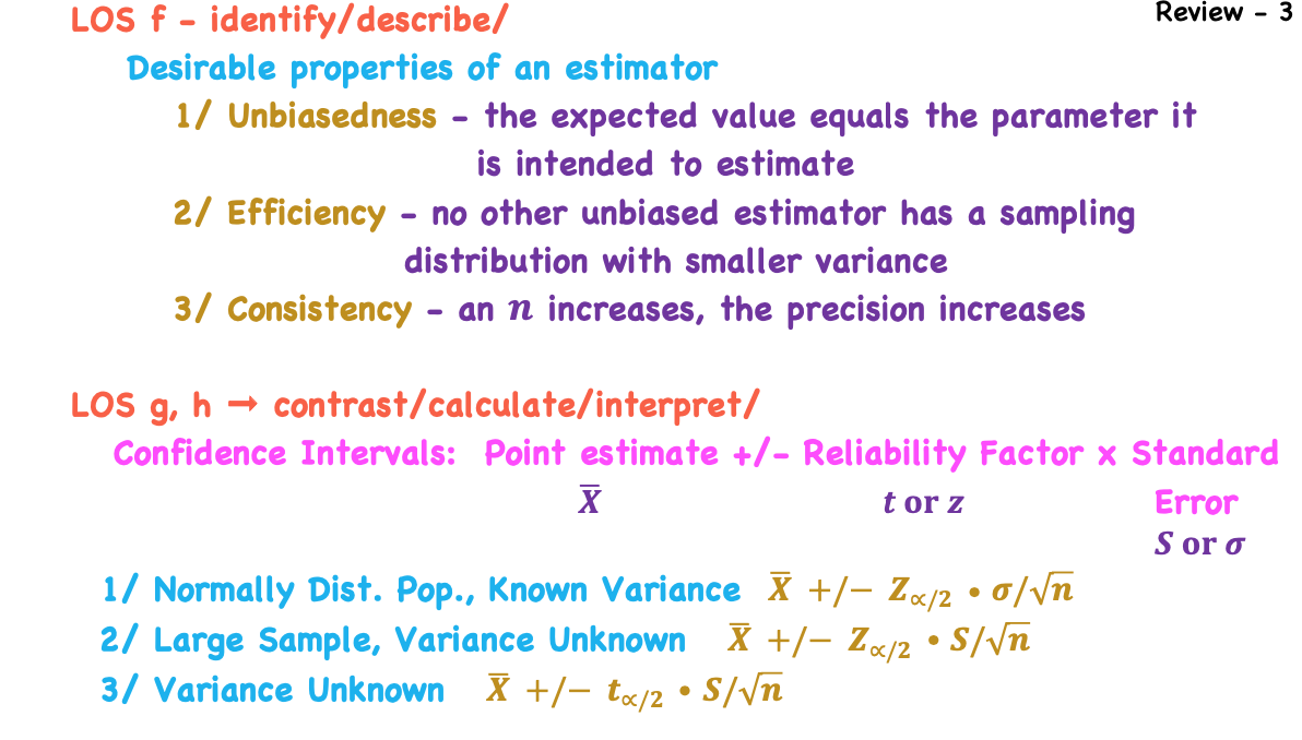 What are three desirable qualities of an estimator, which confidence interval for which situation?