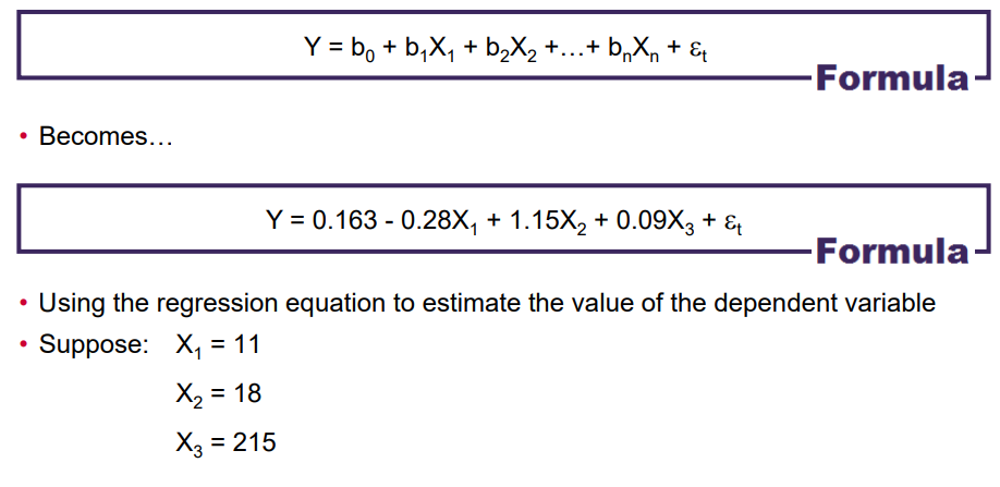 Becomes: Ŷ = 0.163 - (0.28 x 11) + (1.15 x 18) + (0.09 x 215) = 37.13