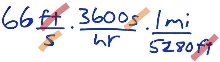 3600/5280 is approximately 2/3 –> 2/3 * 66 = 44 mi/hr. (3600/5280 simplifies to 15/22 –> you can verify this as practice, but if we can approximate and save time that’s great)