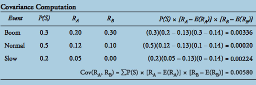 probability weighted average of the products of the random variable’s deviations from their means for each outcome. The probability weighting just provides an expected value WEIGHTED BY PROBABILITY OF AN INITIAL OUTCOME.
