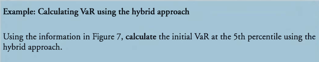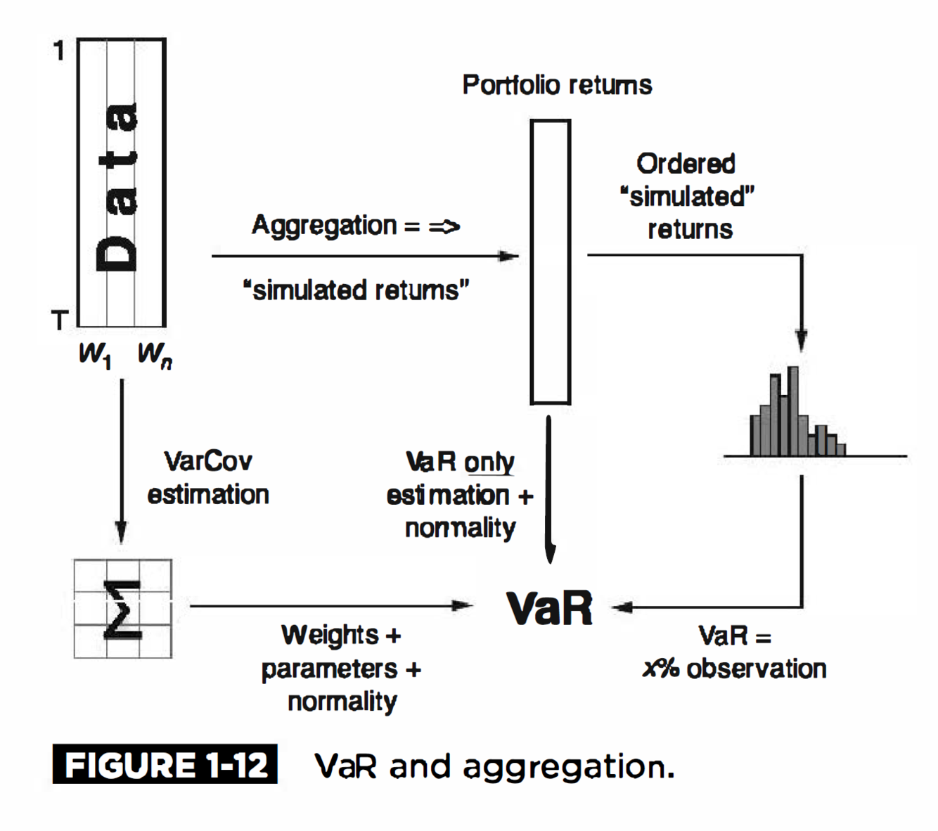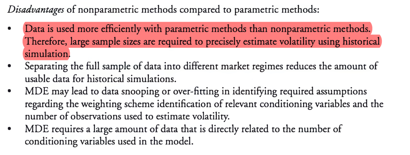 (1)historical based approach: parametric approach, non-parametric approach and hybrid approach (2)implied volatility approach parametric approach: assumption of the underlying distribution ie if the distribution follows random walk, the future variance equals to :….(so the parameter of the distribution has to be define) non-parametric approach: no assumption of the underlying distribution.