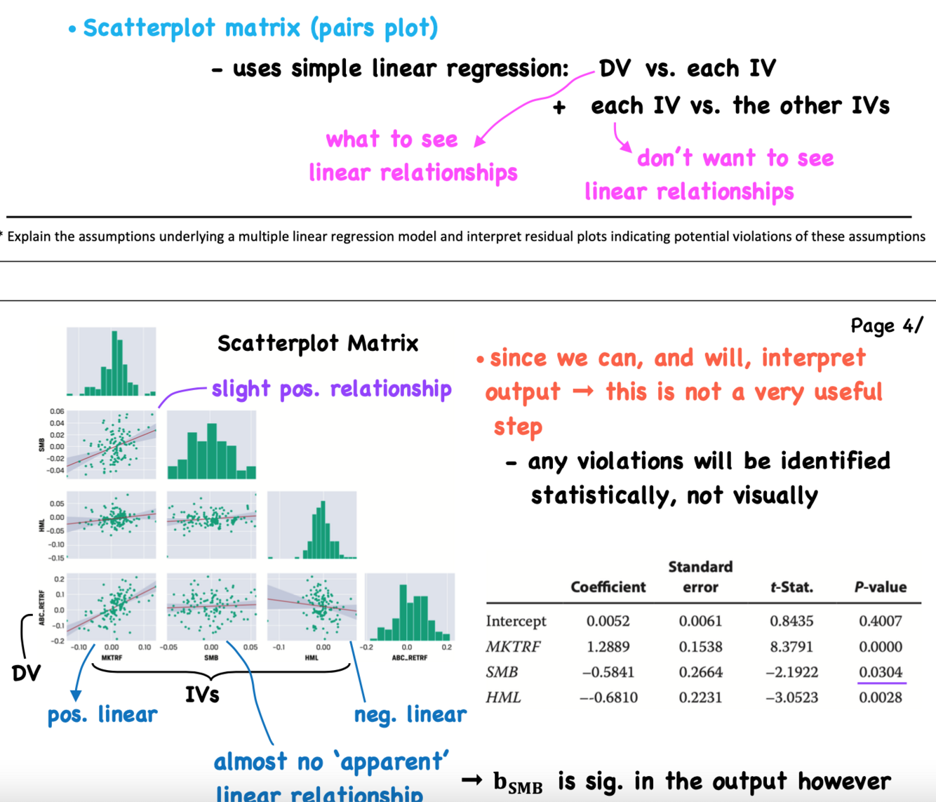 What is a scatterplot matrix and when you do/dont want to see linear relationships? What does it help do?