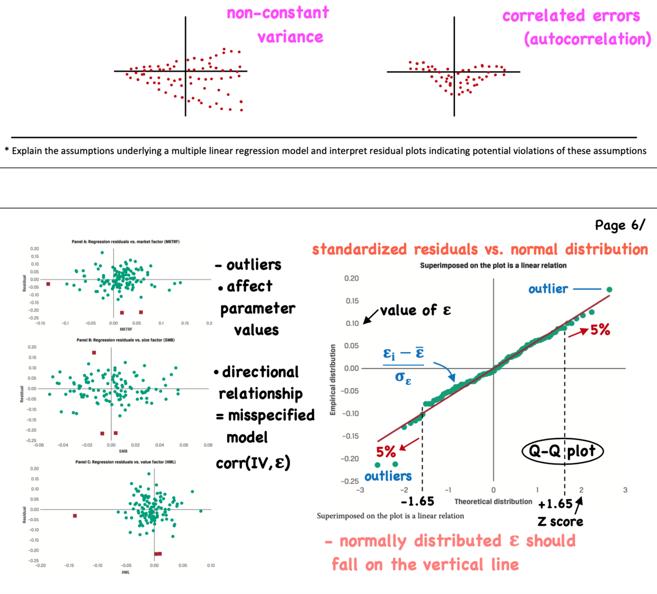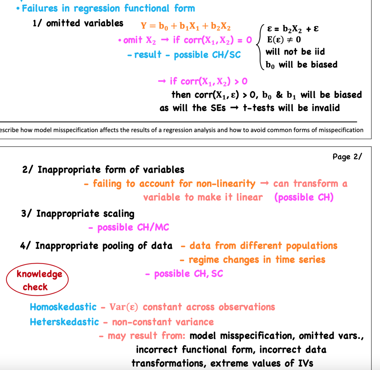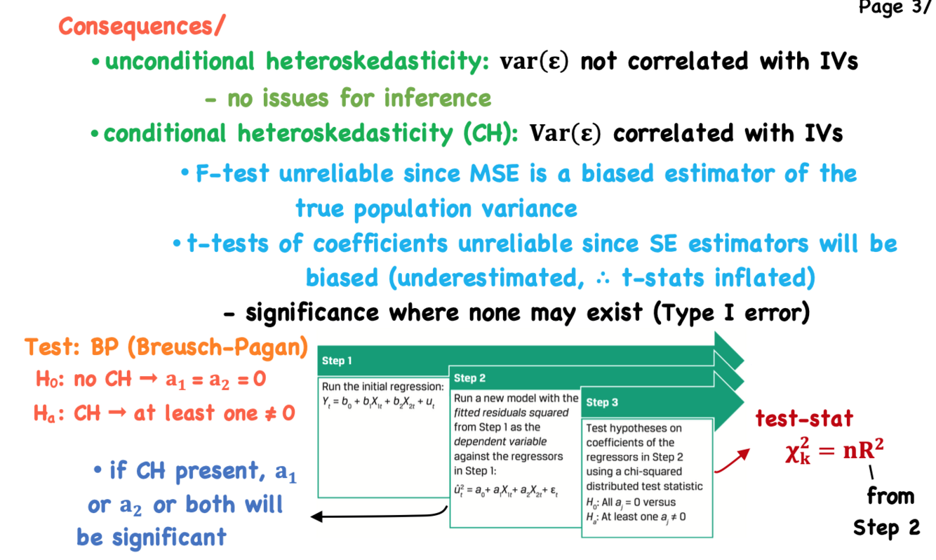What are the consequences from failiure in regression functional form: unconditional heteroscedasticity and conditional heteroskedasticity, how to test for CH?