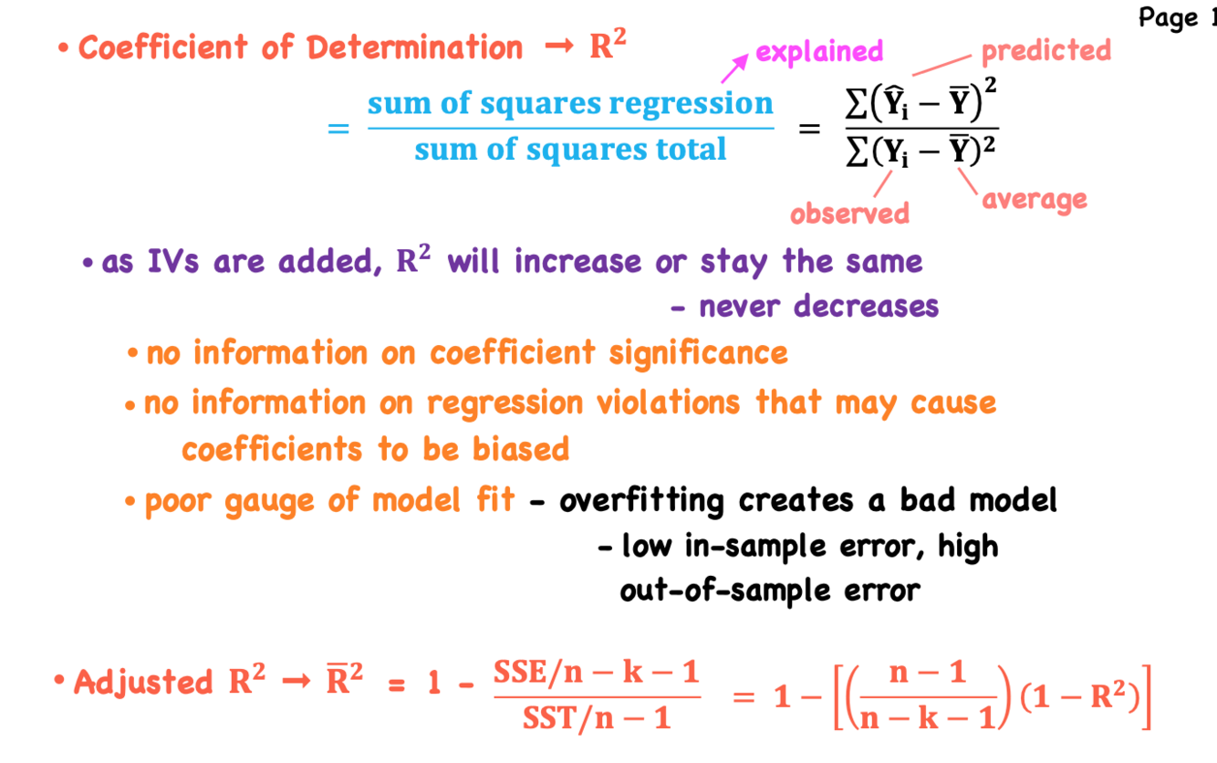 What is the coefficient of determination, what happens to R^2 as IVs are added, what does R^2 not tell us? Adjusted R^2 formula?