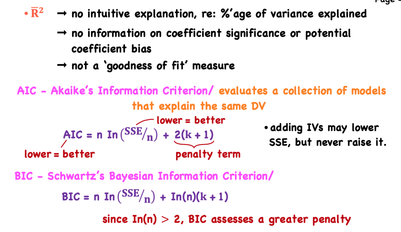 Adjusted R^2 what it does and does not tell us? What is AIC and BIC? When should each be used?