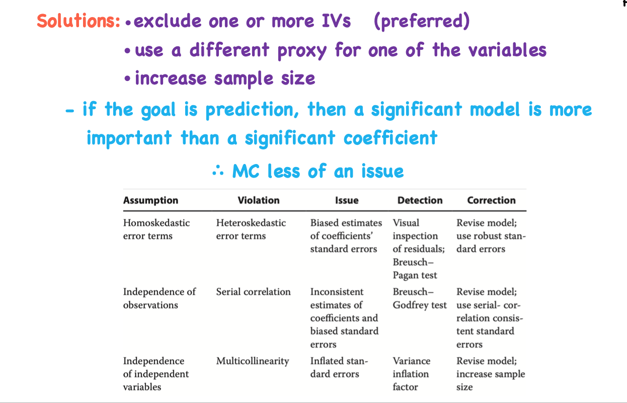 What are the solutions of MC? Explain the assumption, violation, detection and solution to Homoskedastic errors, Independence of observations and independance of independent variables