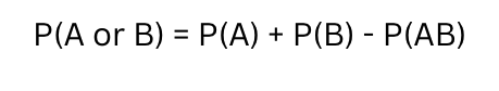 The probability that A or B occurs equals the probability that A occurs, plus the probability that B occurs, minus the probability that both A and B occur.