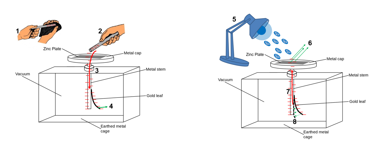 2. Electrons are liberated from the metal surface (by light above f0) so the stem and leaf become neutrally charged again