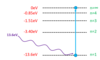 1. Calculate then energy difference between the energy levels 2. Convert energy difference to Joules 3. Convert to f or λ (E=hf or E=hc/λ)