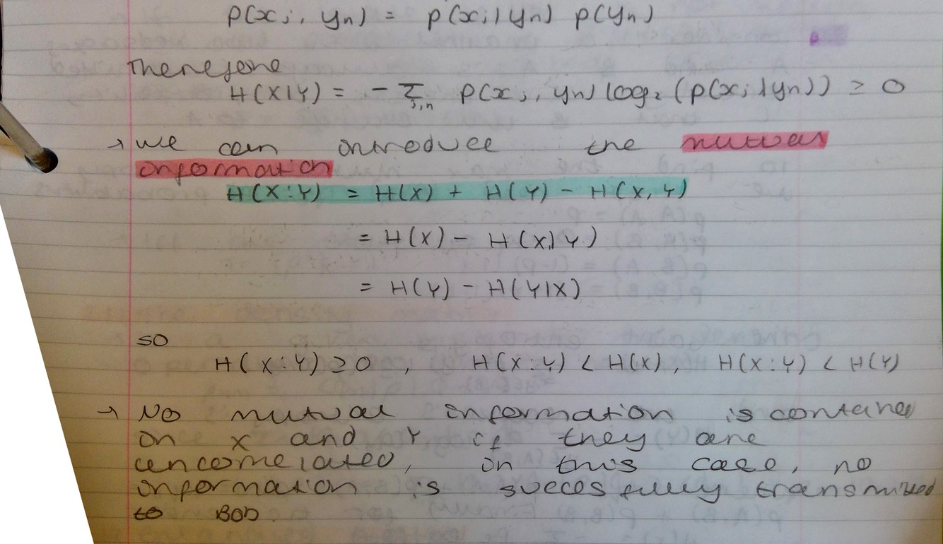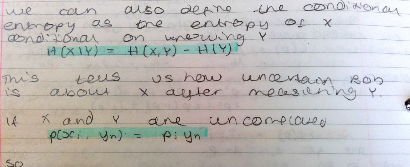 The entropy of X conditional on knowing Y - tells us how uncertain Bob is about X after measuring Y.