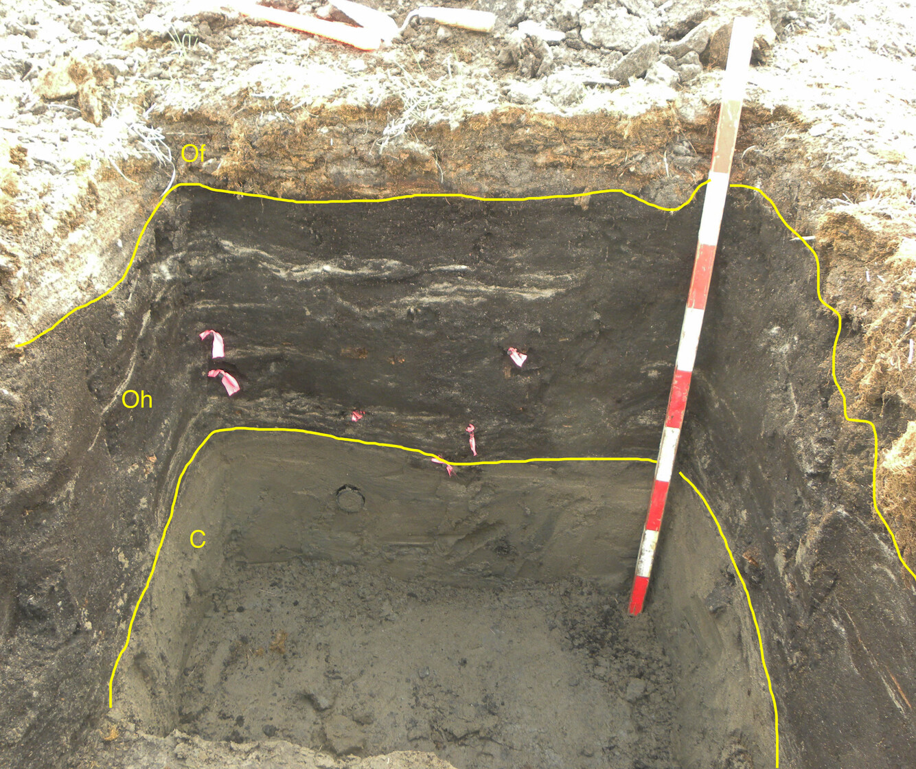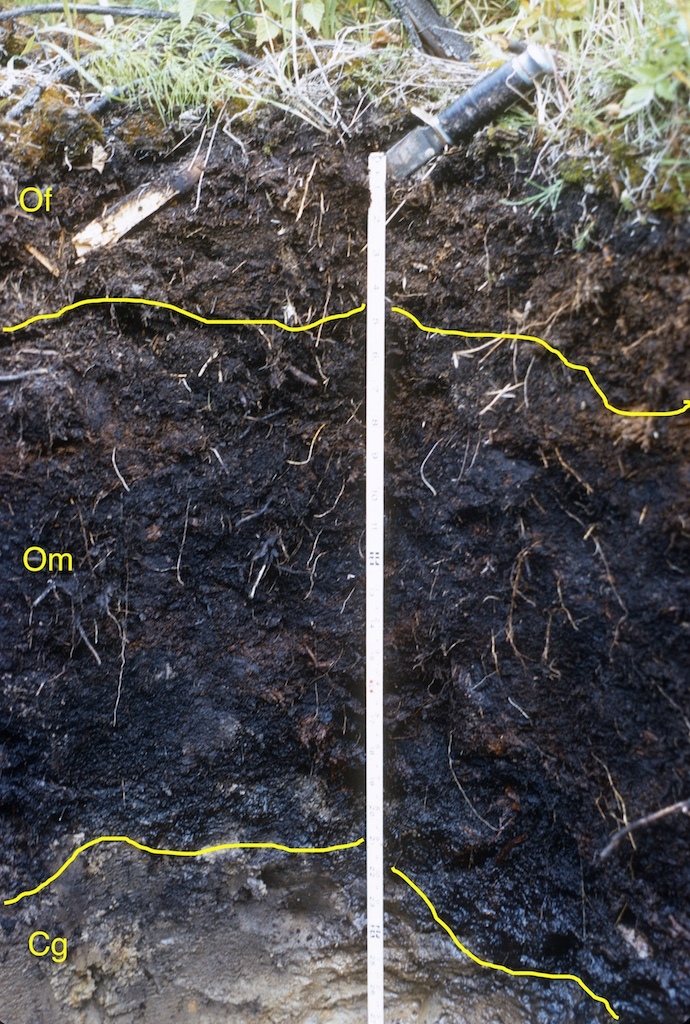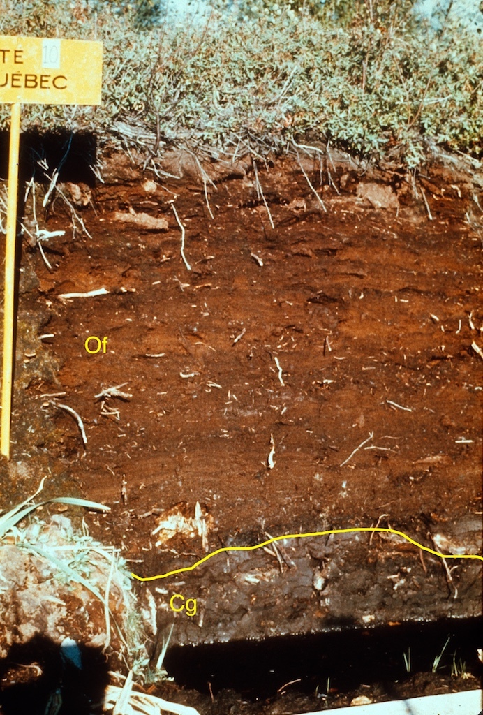 Organic soils form from the mineral surfaces upwards as successive layers of plant residues buildup from the mineral surface due to the oxygen-depleted conditions in wetlands. In the Fibrisols the dominant material in the middle tier of the soil is fibric, composed of largely undecomposed organic material whose botanical origin is readily identifiable. Soils of this great group occur extensively in Canada , particularly in peat deposits dominated by sphagnum mosses. This example has a mineral Cg horizon at its base.