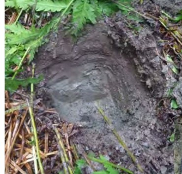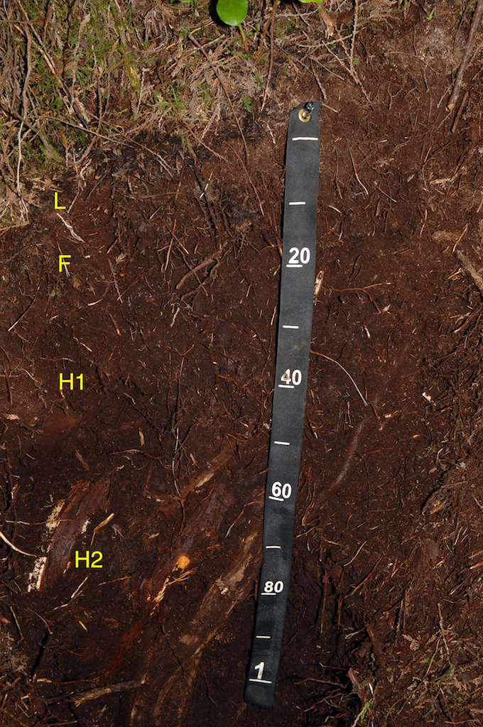 Folisols are Organic soils composed of thick (> 40 cm) of forest floor (folic) material that accumulate on the mineral surface in wet forests such as those in coastal B.C. and the coastal islands such as Haida Gwaii. The lower two layers in this example are composed of organic material in an advanced state of composition (H horizon) and large pieces of woody material. They are overlain by horizons with little (L) or intermediate (F) levels of decomposition.