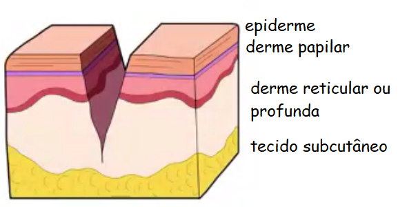 2° grau profunda: derme reticular - sem palidez a digitopressão - cor vermelha desbotada (+fraca) - menos dolorosas - necessita de tto cirurgico: debridamento e enxertia - para evitar cicatrização hipertrófica