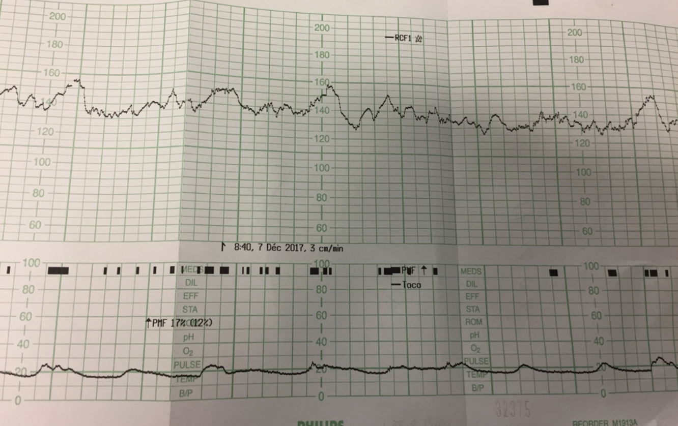 Un test de réactivité fœtale est fait à une dame enceinte de 36 semaines puisqu’elle ne sentait pas son bébé bouger depuis 12h.