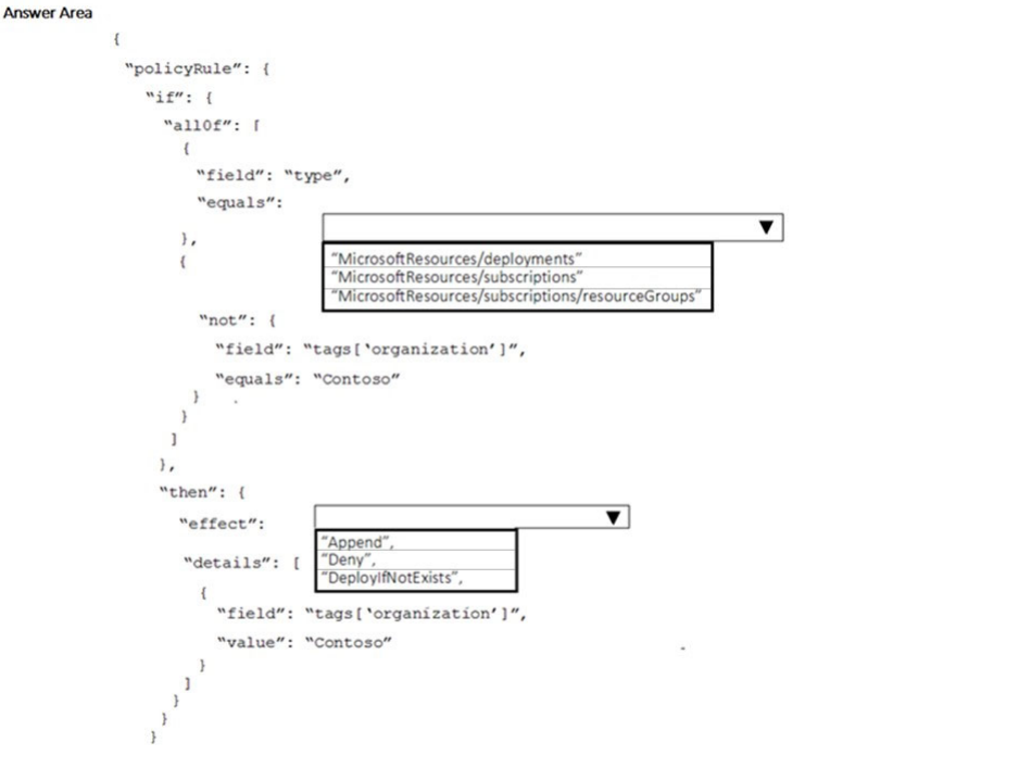 HOTSPOT - Your company has an Azure subscription. The company requires that all resource groups in the subscription have a tag named organization set to a value of Contoso. You need to implement a policy to meet the tagging requirement. How should you complete the policy? To answer, select the appropriate options in the answer area.