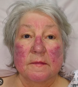 Malar flush refers to red discolouration of the skin over the upper cheeks and nose. It is due to the back pressure of blood into the pulmonary system, causing a rise in CO2 and vasodilation.