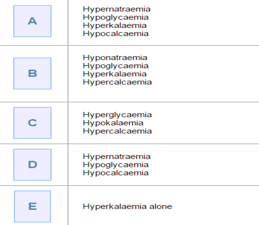 This causes progressive dehydration, a metabolic acidosis and marked electrolyte disturbances, in particular; hyponatraemia, hypochloraemia and hypokalaemia.