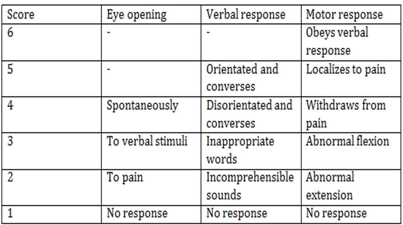 The Glasgow Coma Scale is used to give an objective and reliable tool to interpret a patient’s neurological status. It is composed of three tests: eyes, verbal and motor response. The three values are considered separately as well as the total. The lowest possible score is 3, which represents deep coma or death; 15 is an alert and conscious person.