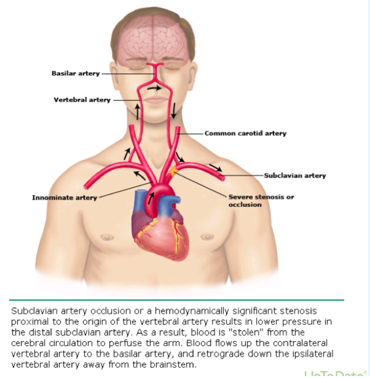 lors d’une obstruction (ou sténose importante) de l’artère sous-clavière en amont de l’origine de l’artère vertébrale, s’il y a une augmentation des besoins en sang du membre supérieur (ex: exercice), le flot dans l’artère vertébrale ipsilatérale peut s’inverser pour répondre au besoin du bras au détriment du cerveau (cf. schéma)
