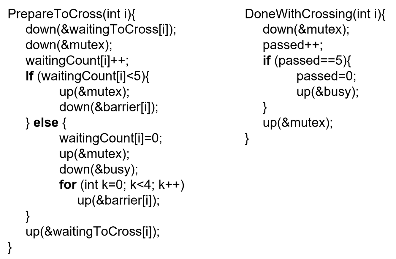 It is done by adding a new mutex which is responsible of having the first 4 vehicles wait for the fifth to come. Once the fifth comes, it releases them.