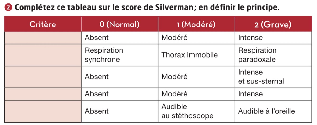 Le score de Silverman est un outil utilisé en pédiatrie néonatale pour diagnostiquer et évaluer la détresse respiratoire d’un nouveau-né. Il se compose de cinq paramètres notés de zéro à deux, qui incluent le balancement thoraco-abdominal, le tirage intercostal, l’entonnoir xiphoï-dien, le battement des ailes du nez et le geignement respiratoire. Un score supérieur à quatre indique une détresse respiratoire significative, nécessitant potentiellement une intubation.
