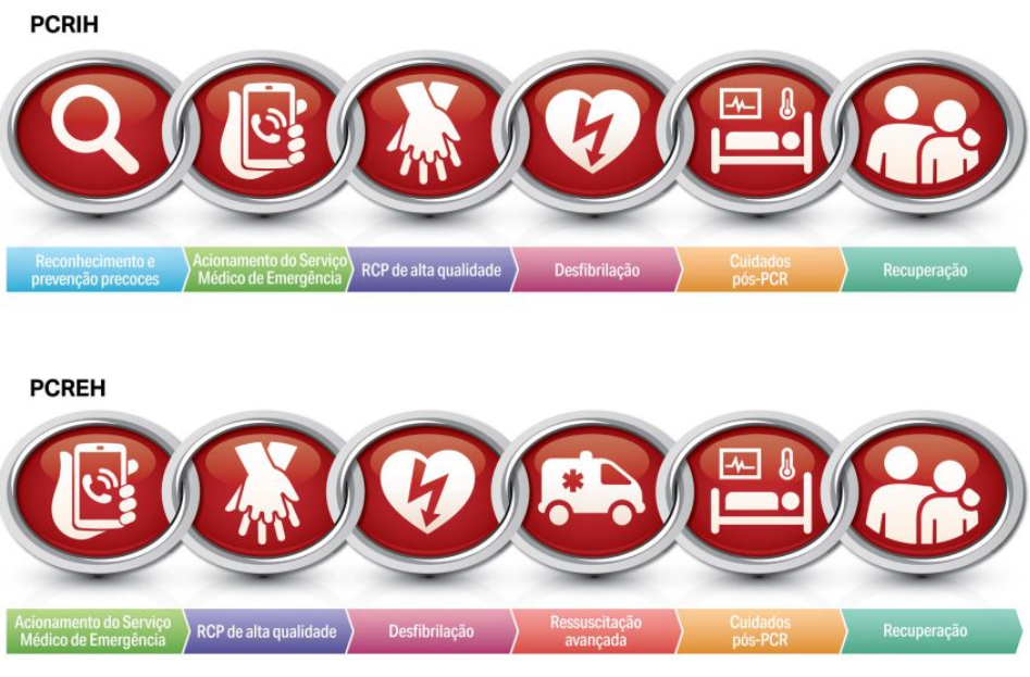 Como é a cadeia de sobrevivência na PCREH e PCRIH?