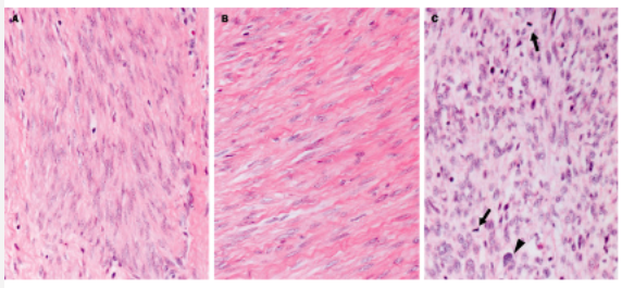 C: a malignant leiomyosarcoma is hypercellular and less fascicular, and consists of atypical smooth-muscle cells with hyperchromatic, enlarged nuclei. Increased mitotic figures and necrosis are frequent histological findings in leiomyosarcomas