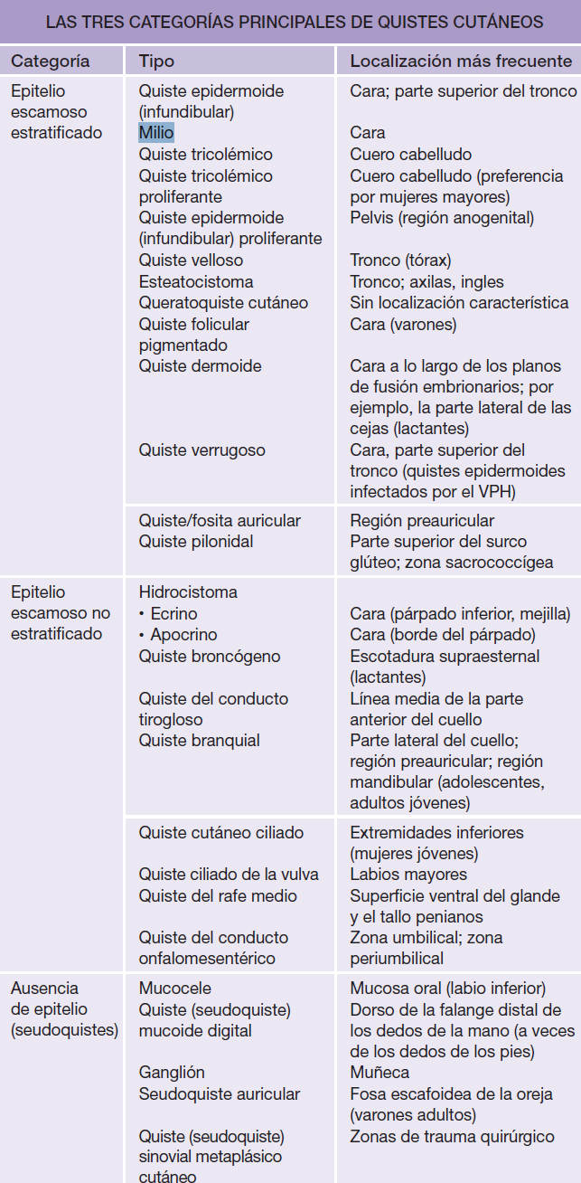LOS QUISTES EPIDERMOIDES PEQUEÑOS Y SUPERFICIALES RECIBEN EL NOMBRE DE MILIOS (V. MÁS ADELANTE).