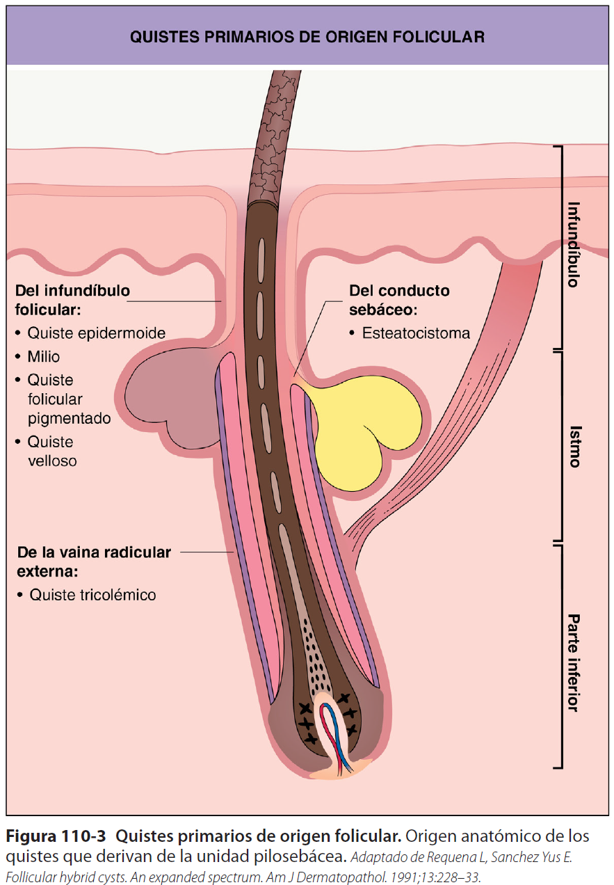ESTOS QUISTES DERIVAN DEL INFUNDÍBULO FOLICULAR; DE AHÍ EL SINÓNIMO DE QUISTES INFUNDIBULARES (FIG. 110-3).