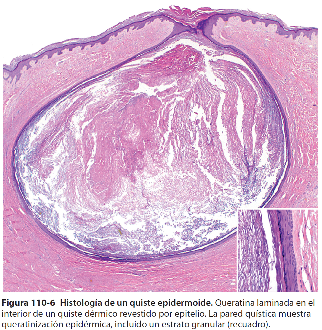 EN EL EXAMEN HISTOLÓGICO SE IDENTIFICA UNA CAVIDAD QUÍSTICA LLENA DE QUERATINA LAMINADA Y REVESTIDA POR UN EPITELIO ESCAMOSO ESTRATIFICADO QUE COMPRENDE UN ESTRATO GRANULAR (FIG. 110-6).