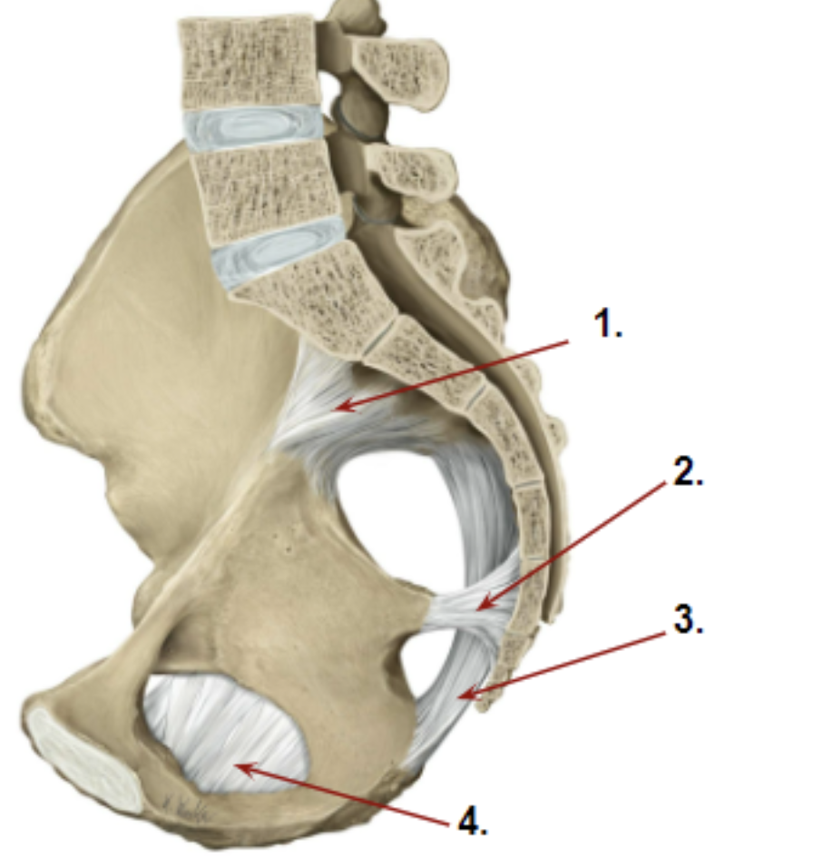 Which of the arrows is indicating the structure that divides the greater sciatic foramen from the lesser sciatic foramen?