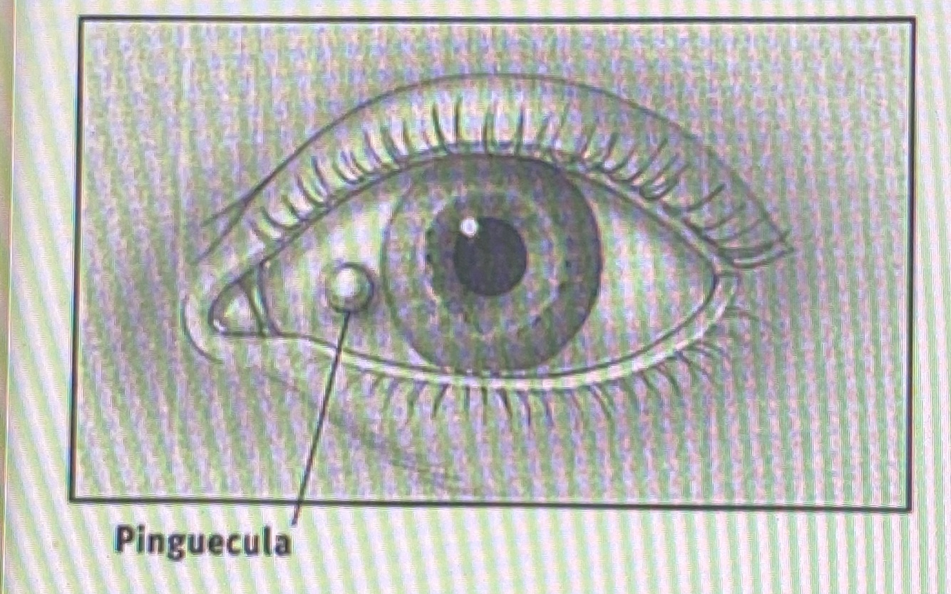 Yellowish patch or bump on the white of the eye, most often on the side closest to the nose.