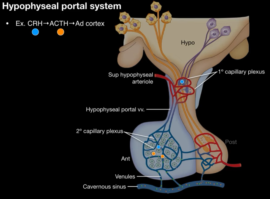 Which arteriole feeds into the hypophyseal portal system? Which sinus does the hypophyseal portal system drain into?