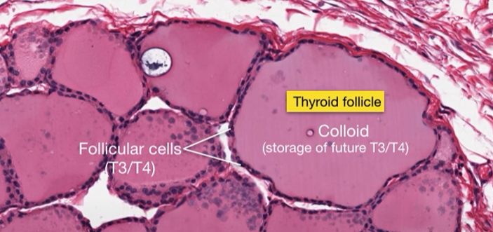 What types of cells surround colloid in the thyroid? What structure do these two cell types form?
