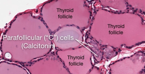 What other major cell type forms aggregates in between thyroid follicles?