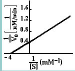 In the above double-reciprocal plot, the Y-axis intercept represents 1 / V max, which has the value 0.4 µM/min. Since 1 / V max = 0.4 V max = 2.5 µM/min Therefore the correct answer is “e”