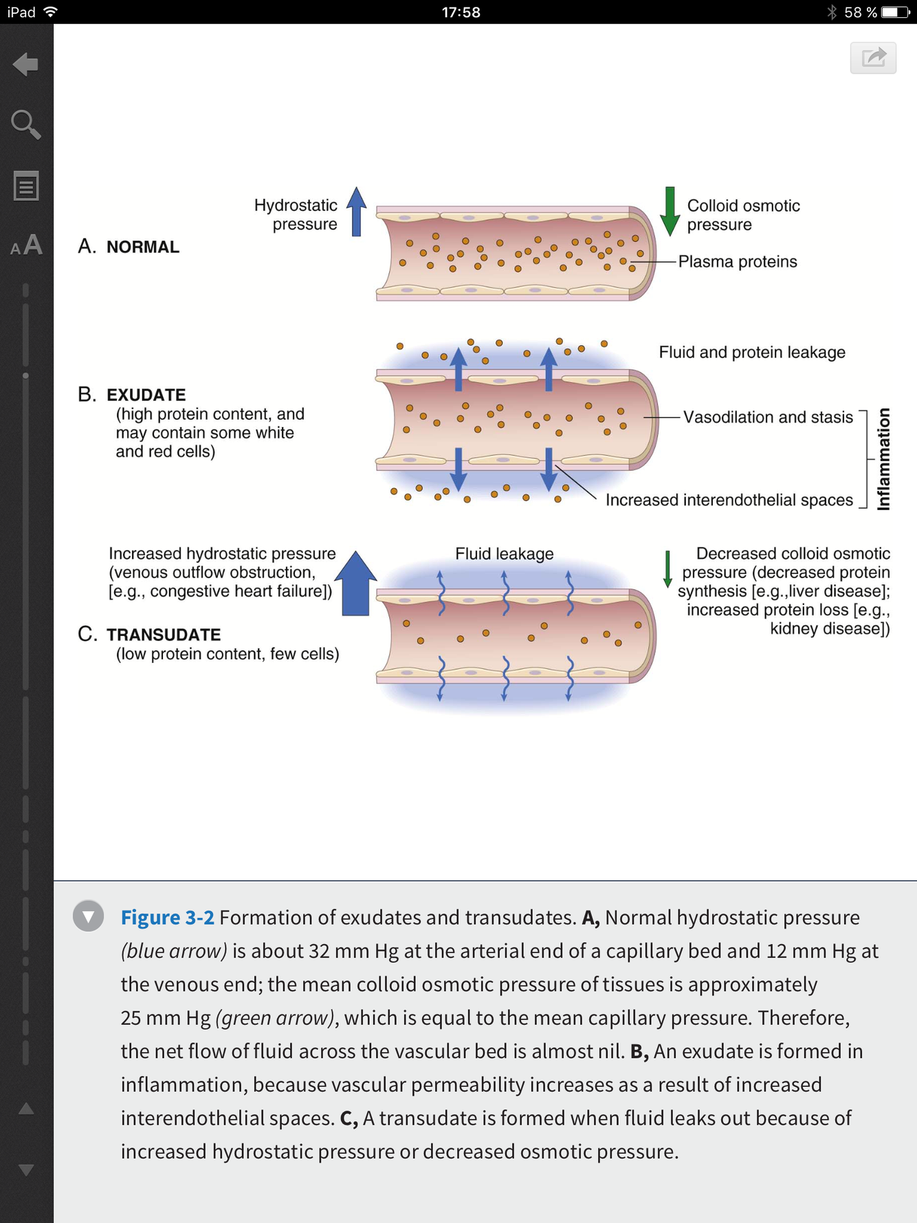 Exsudat: fluide extravasculaire avec une haute concentration en protéine et débris cellulaire. Implique une perméabilité vasculaire augmentées des petits vaisseaux par injure au tissus et inflammation. Transudat: fluide extravasculaire avec une concentration faible en protéine (la plupart albumine), peu ou pas de matériel cellulaire. Résultat d’un débalancement entre l’équilibre osmotique et hydrostatique du vaisseaux. L’oedème est un excès de fluide dans les tissus interstitiels ou dans des cavités sérieuses: Il peut être un exsudat ou un transudat. Le pus est un exsudat purulent riche en leucocytes (la plupart PMN), débris cellulaires et cellules mortes et souvent avec des microbes.