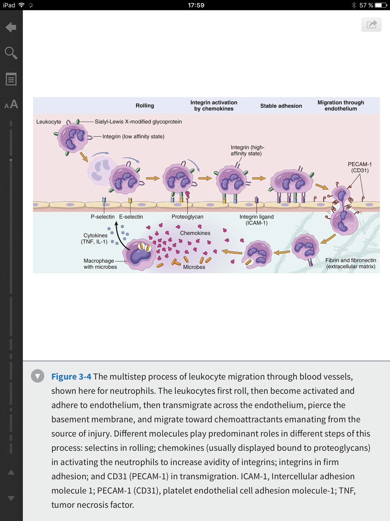 L’adhésion plus forte des leucocytes sur l’endothélium est dédiée par les intégrines exprimée par les leucocytes. Le TNF et IL-1 induisent l’expression des ligands des intégrines sur les cellules endothéliales (VCAM-1, ICAM-1). L’affinité des intégrines sur les leucocytes est augmentée par les chimiokines relâchée au site d’inflammation, ce qui permet au leucocytes de freiner son roulement, d’organiser son cytosquelette et de traverser l’endothélium.