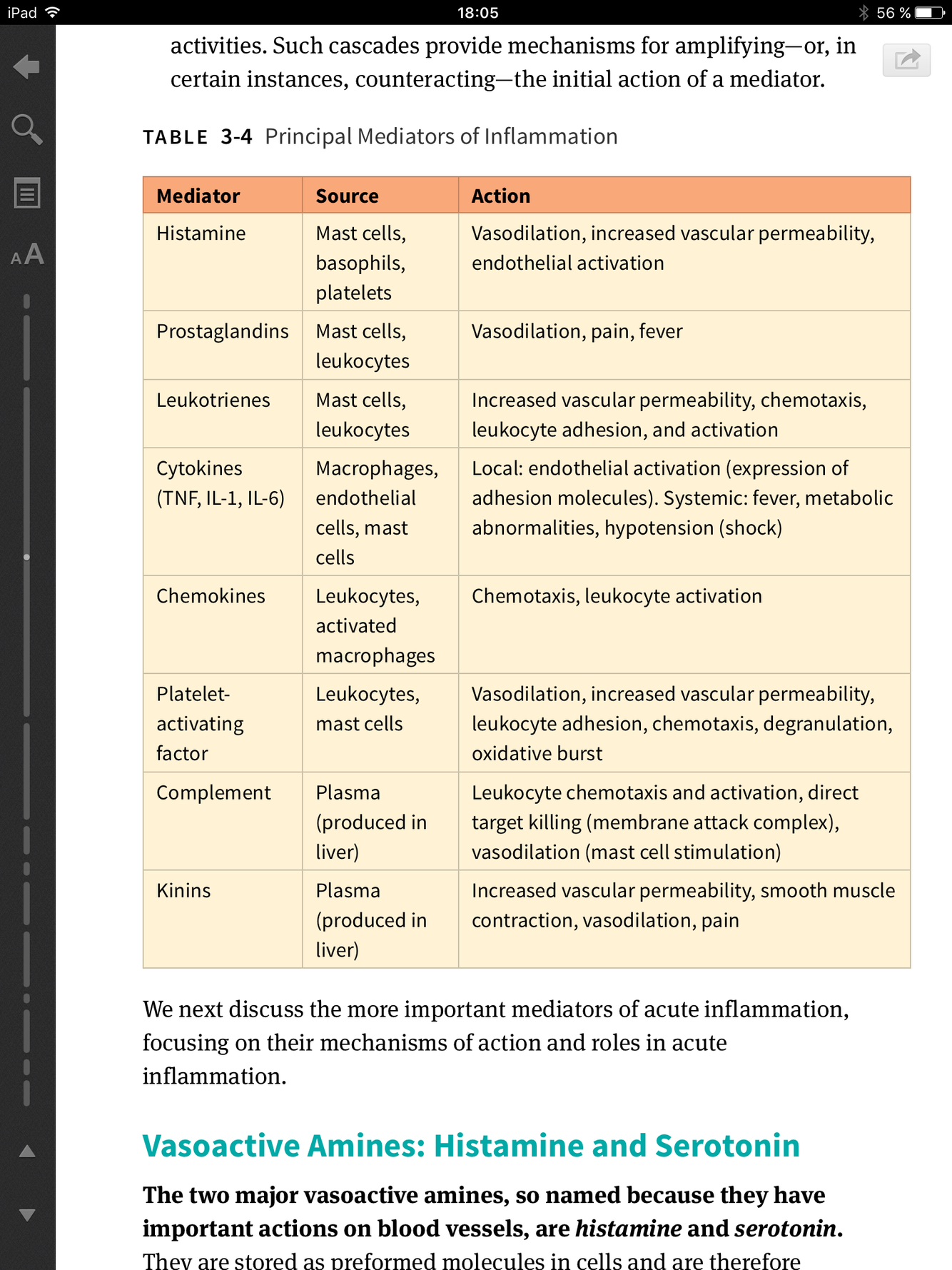 Nommer les principaux (8) médiateurs de l’inflammation, leur source et leur action principale.